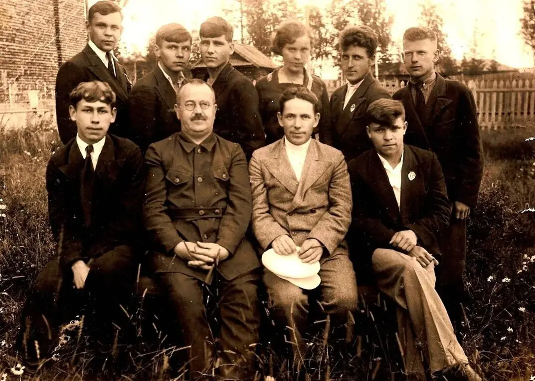 Выпускники Исовского горного техникума 1936 года с директором А.Г. Федюневым. Снимок сделан в ноябре 1934 г. Н. Карачевым. / Фото представлено Н.А. Алексашенко.