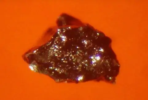 Они обладают стально-серым цветом, металлическим блеском, изометричной, угловатой формой и характеризуются заметной ферромагнитностью. Всего изучено 36 зерен минерала размером 0,15-3.0 мм.(2) Поверхность зерна размером 3 мм в основном обладает темно-серой окраской, матовым блеском, на сколах - стально-серое с металлическим блеском. На нем заметны углубления удлиненно-призматической формы, размером до 0.8 мм, которые, возможно, являются следами его срастаний с минеральными зернами призматического облика, выкрошившимися за время пребывания зерна в россыпи. Данные анализов показали, что в изученных зернах присутствуют различающиеся по составу железо-хромовые карбиды.